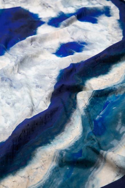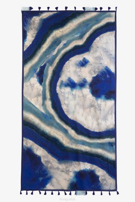 A work of art in itself. 100% organic cotton rectangular foulard with finish of fringe and frayed pom poms on its sides in matching colour blue. A pattern of yarn trimming stands out on its artistic print in blue and white as faded watercolour.
