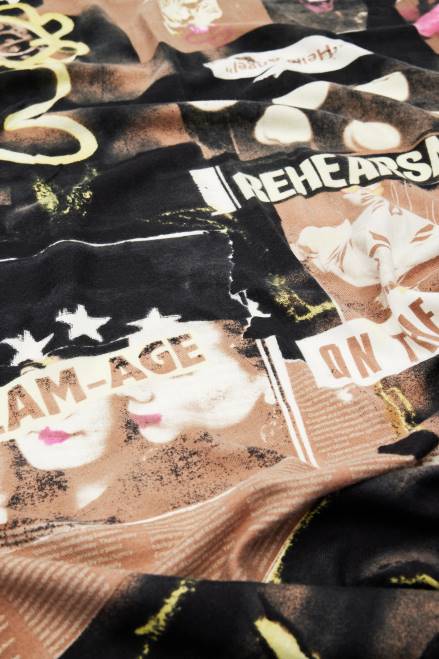 A rectangular foulard in soft fabric with a check weave and arty print.