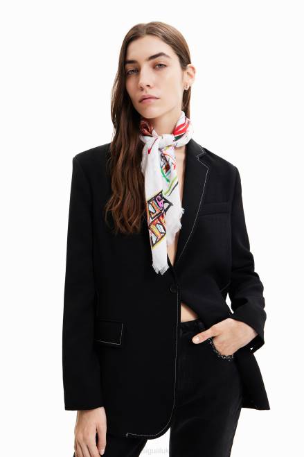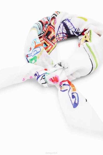 A square foulard with illustrations and messages in a hand-painted effect by designer Javier Mariscal.
