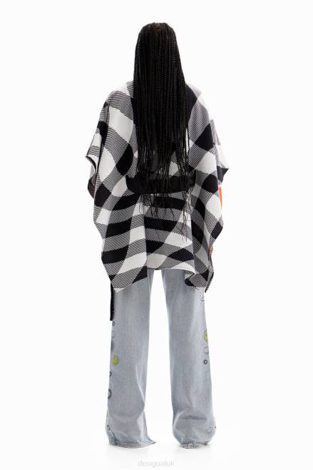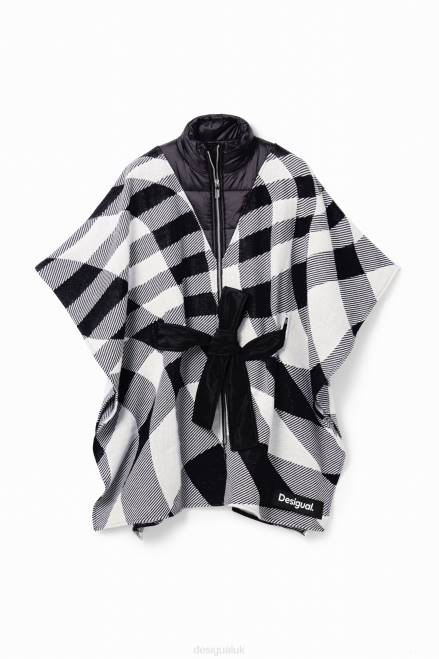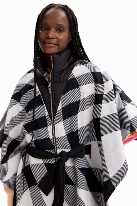 An oversize poncho that's open at the sides with a belt and zip. In wool-style plaid fabric combined with quilting on the neck.