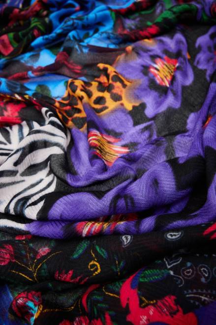 Multicoloured patchwork print with animal print, geometric motifs and flowers