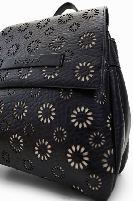 A small backpack with several compartments and pockets, in leather-effect fabric with geometric die-cut flowers.