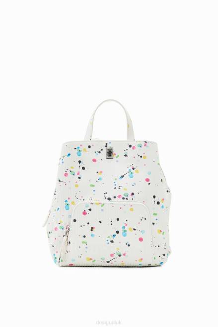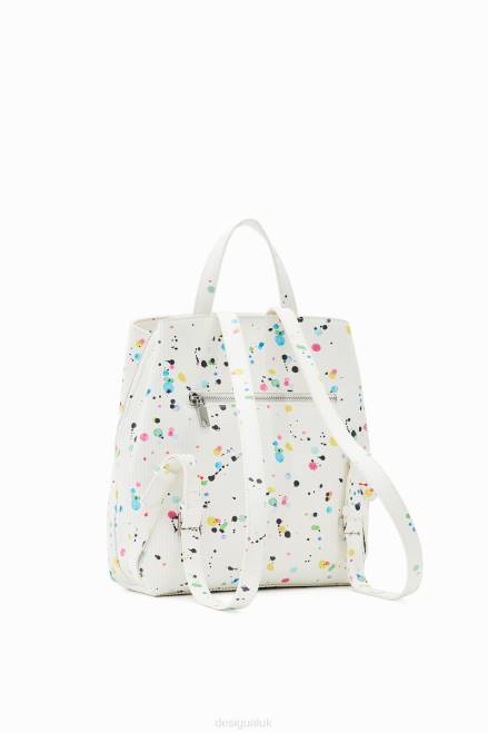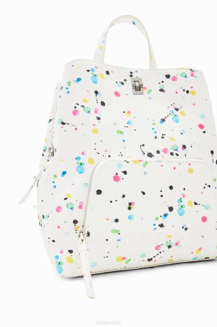 A small backpack in leather-effect fabric with a texture of stripes and paint drops, and multiple handles, compartments and pockets.
