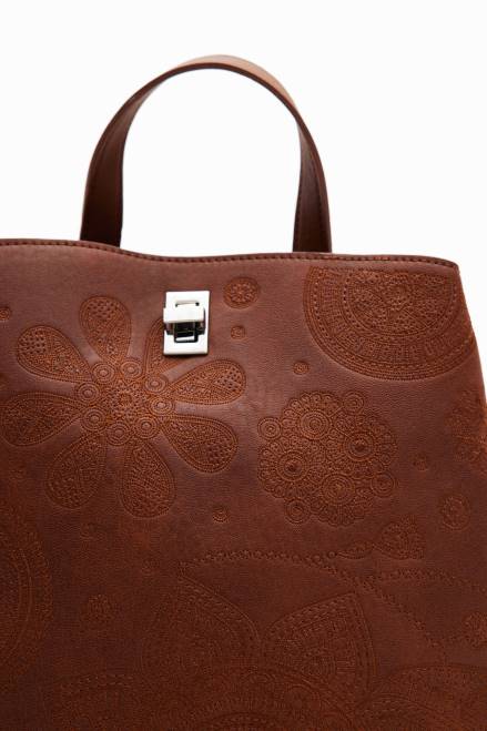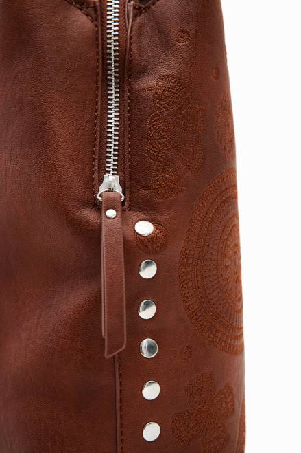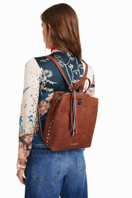 A hanging charm of trekking type cords adds a touch of colour to this small backpack made in leather effect fabric with elegant matching embroidered mandalas.