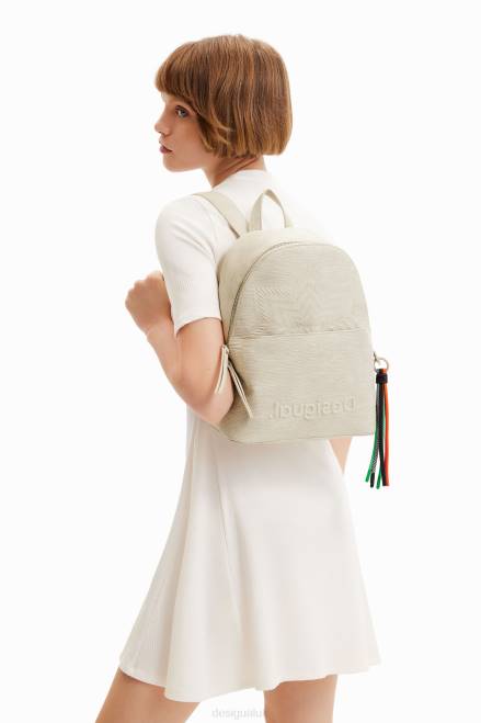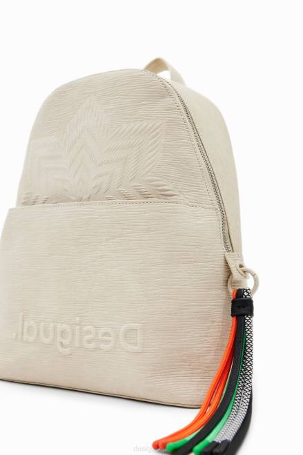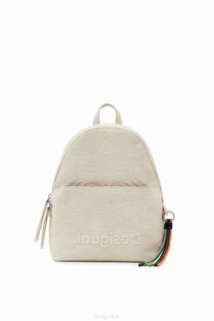 A small backpack in fabric with a leather-effect texture and star embossing. Featuring several straps and pockets.