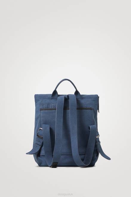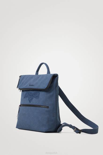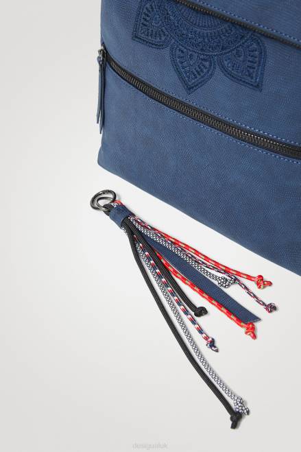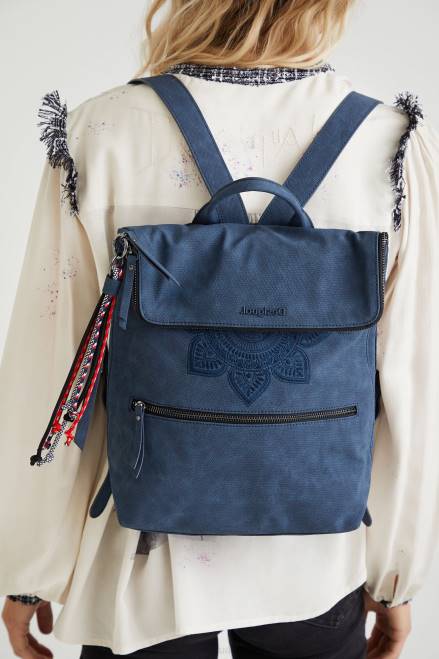 Functional backpack with square silhouette, extensible flap and zip fastener with embossed matching mandala and outer compartment. A keyring of cords decorates the accessory, giving contrast.