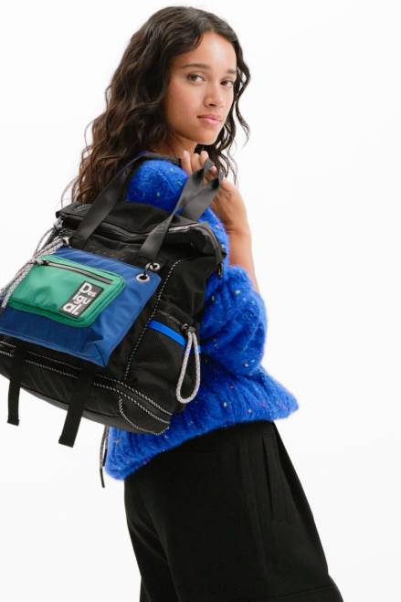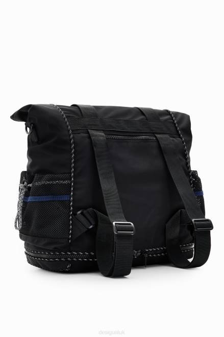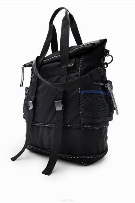 A spacious nylon backpack with several straps that convert it into a handbag. Includes a small, detachable crossbody bag and multiple pockets.