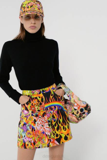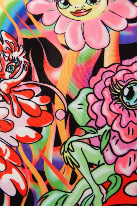 - Arty flame print with characters and surreal motifs