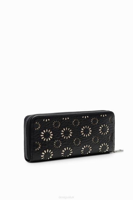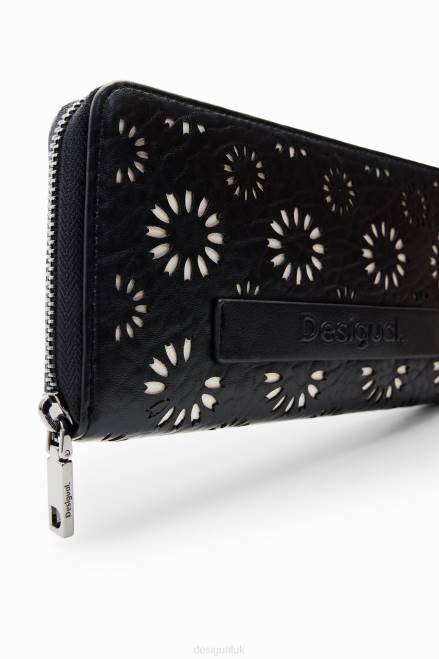 A large rectangular wallet in leather-effect fabric with geometric floral die-cutting and several interior compartments.