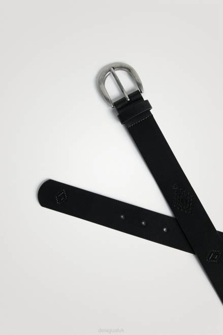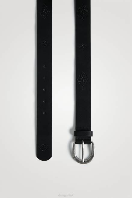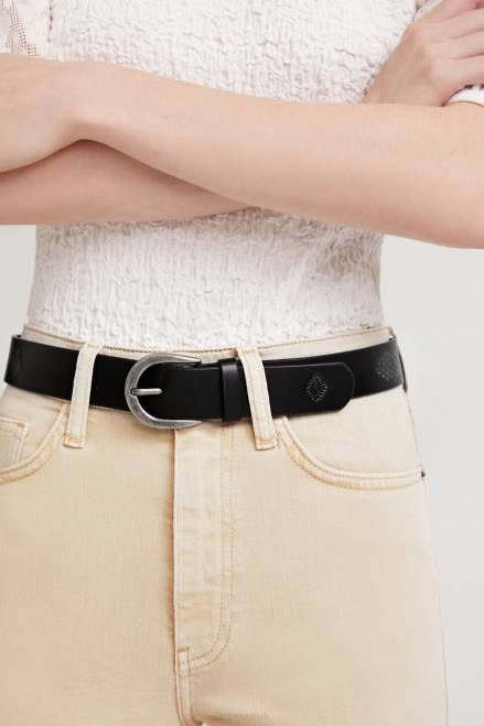 Medium-size black cow leather belt with a silver buckle. Featuring engraved ethnic details, this is a must-have quality basic.