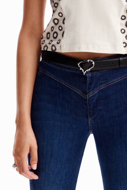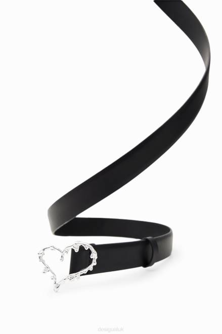 A plain leather belt with a heart-shaped brass buckle and a hand-crafted effect. Designed by Gala Meyer.