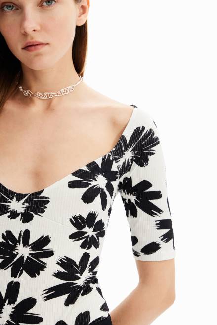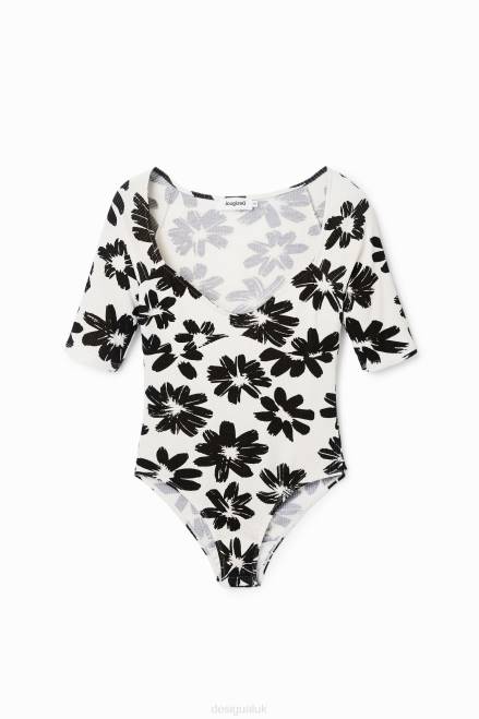 A fitted bodysuit in stretch ribbed knit, with short sleeves and a corset-style under-bust seam. Featuring an arty floral print.