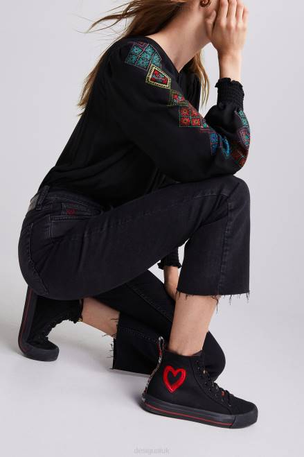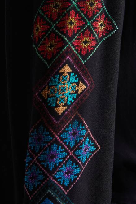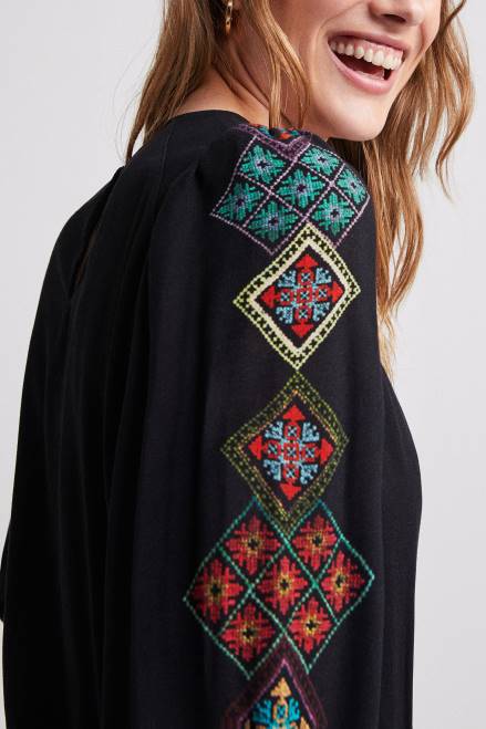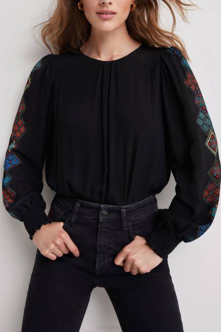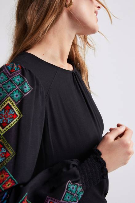 Long-sleeve black bodysuit with embroidered multicoloured motifs. In viscose crepe, with elasticated smock-stitch cuffs, a crew neck and buttons on the back.