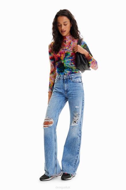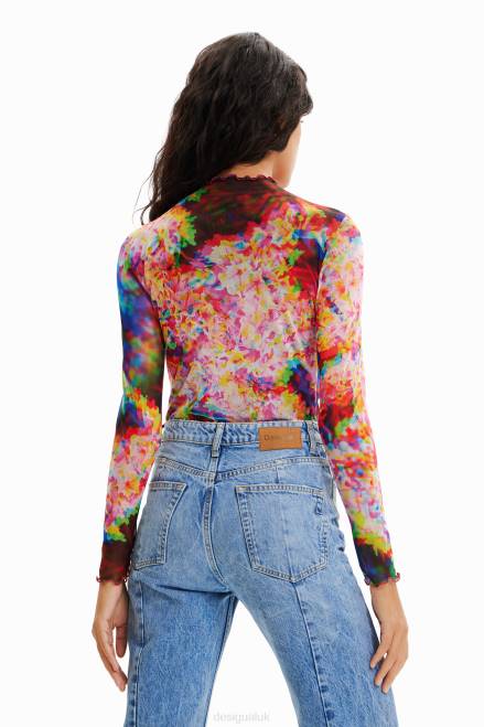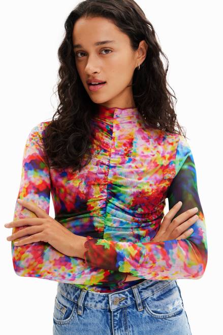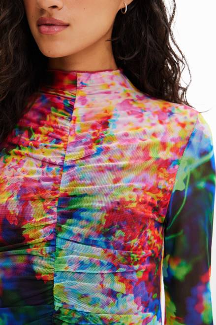 A long-sleeve bodysuit in stretch tulle with draped-effect ruching and a perkins collar. Featuring a floral print.