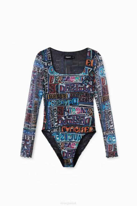 A fitted tulle bodysuit with long sleeves, a square neckline and a print by designer Javier Mariscal.