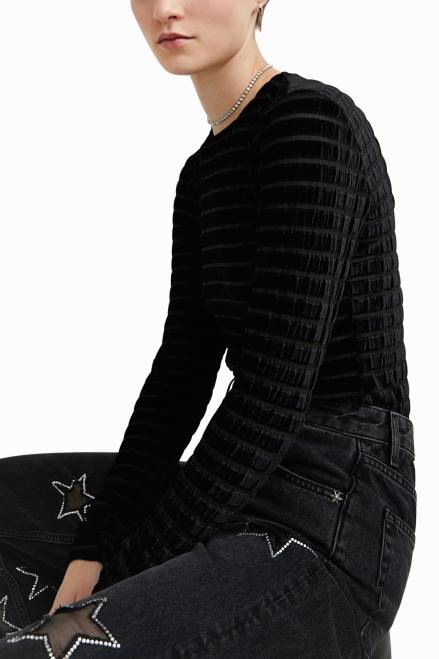 This long-sleeved slim body with a soft velvety feel features vertical stripes in semi-transparent tulle and a sculptural round opening at the back.
