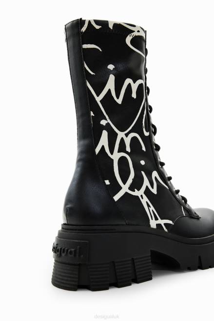 Very high military-style boots with a thick serrated sole, leather-effect fabric with contrasting messages and a lace fastening.