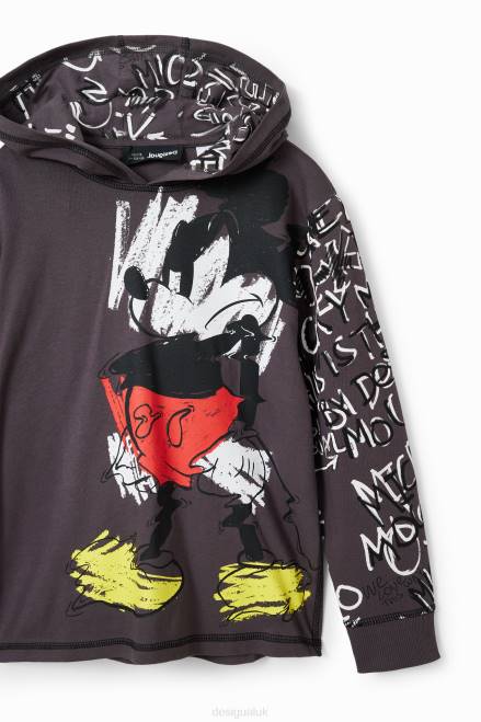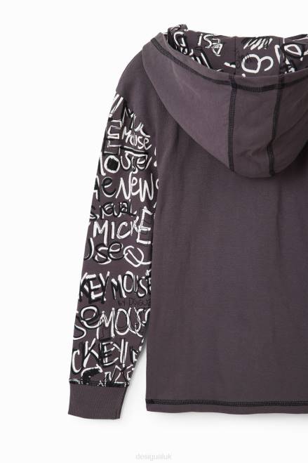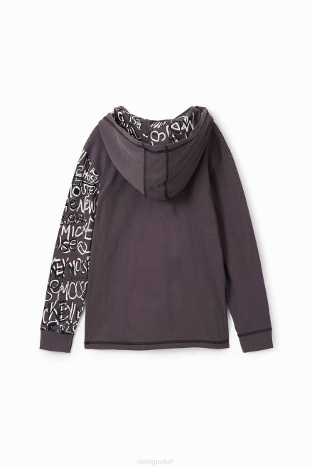 A long-sleeve hooded T-shirt with a text print on the sleeves and Disney's Mickey Mouse on the front.