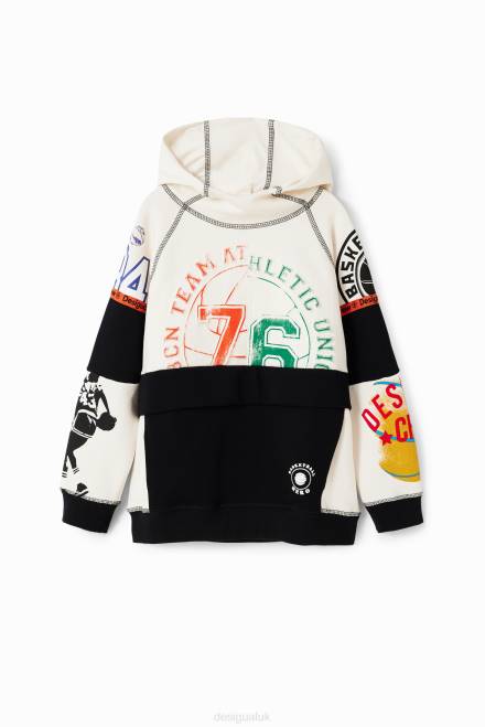 A loose hoodie with a patchwork of contrasting panels and different prints in a sporty style.