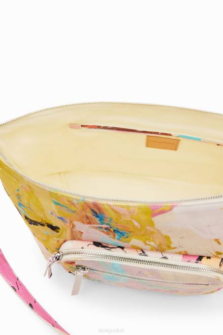 A large crossbody bag in canvas fabric with a print by artist Pink Morro. Featuring a removable charm with trekking-style cords and pockets.