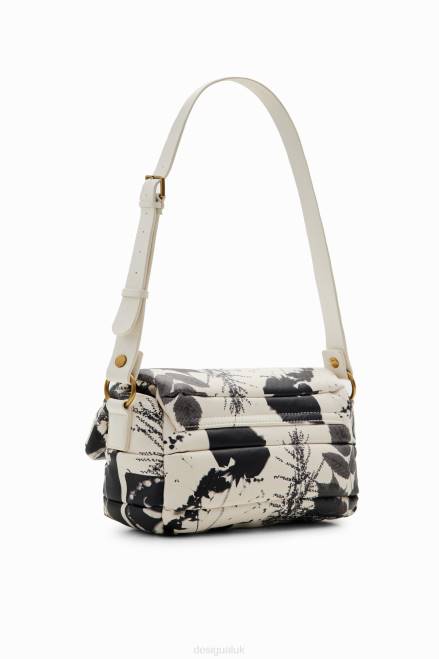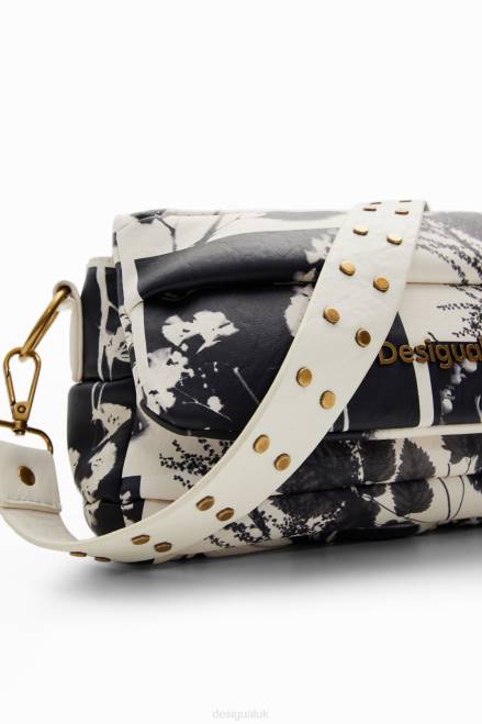 A small leather-effect crossbody bag with a photographic print, several straps and pockets.