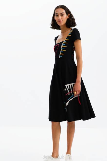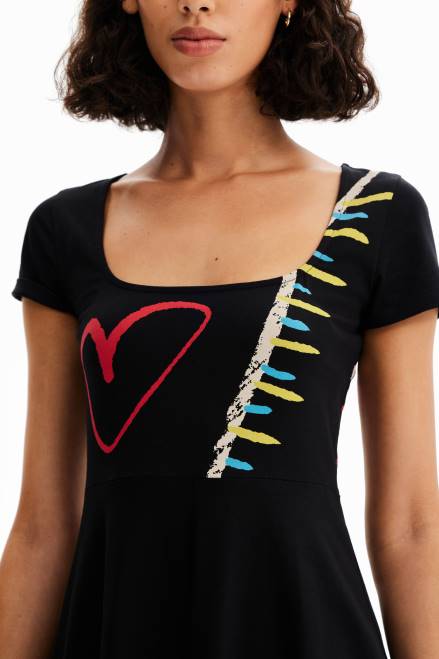 A short-sleeve midi dress in stretch knit, with a fitted body and an A-line skirt. Features an arty print.
