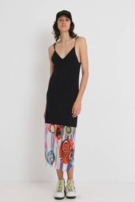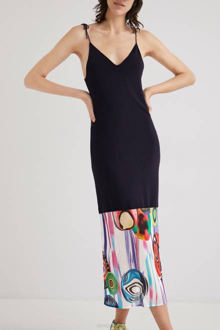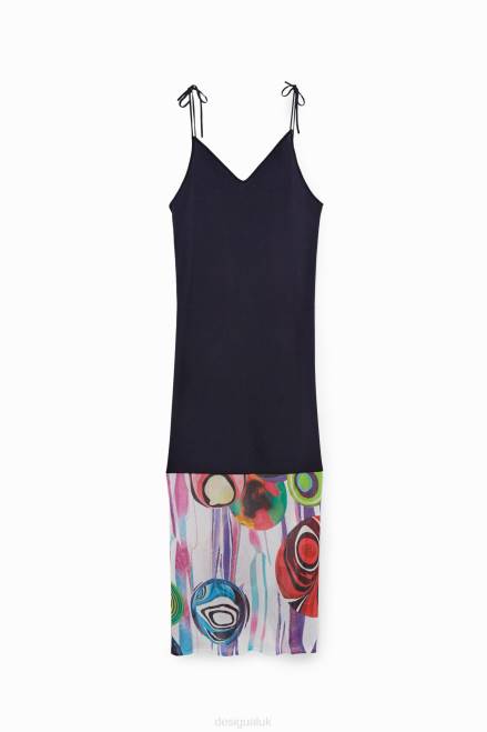 A very fine knit in navy with hems that feature a contrasting white arty print. This dress has thin straps that can be tied as a bow while being very fresh with ample drape.