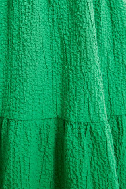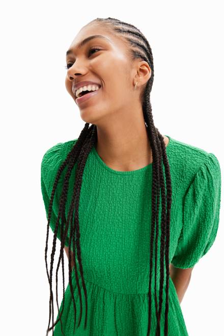 A midi dress with short puff sleeves, with a wide back neckline and textured fabric.