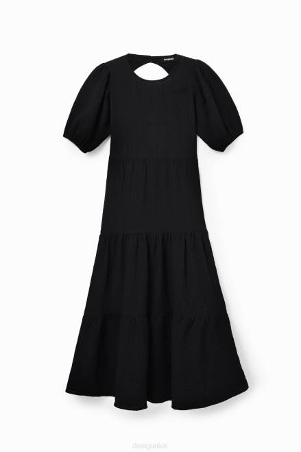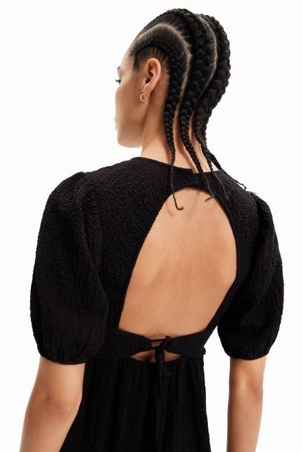 A midi dress with short puff sleeves, with a wide back neckline and textured fabric.