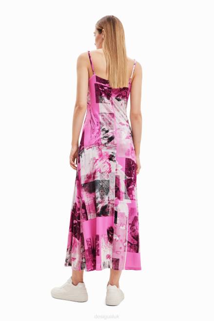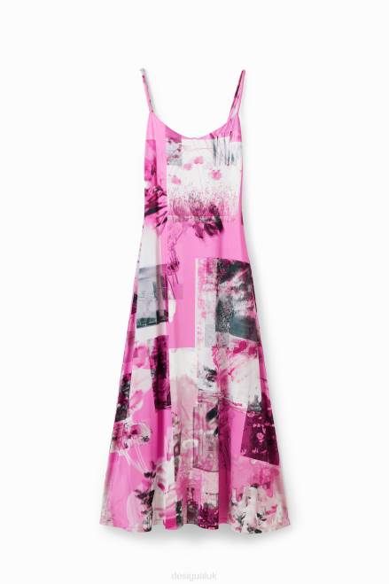 A strappy midi dress with a fitted top part and stretch satin fabric with a collage print.