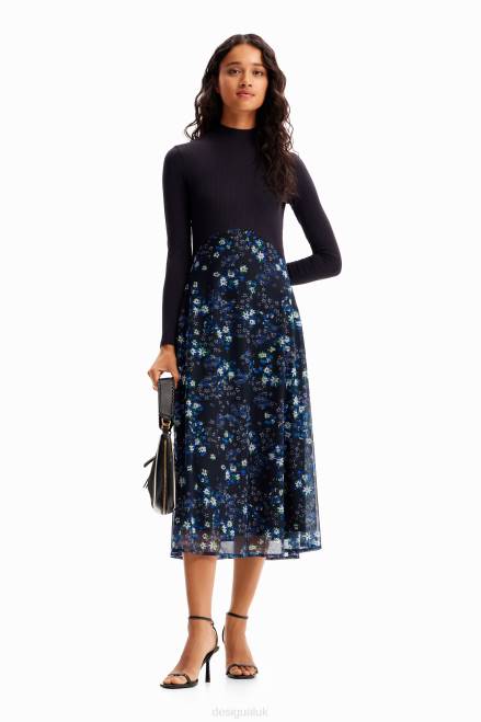 A midi dress with a two-piece effect: a long-sleeve plain ribbed T-shirt and a wide tulle skirt with a floral print.