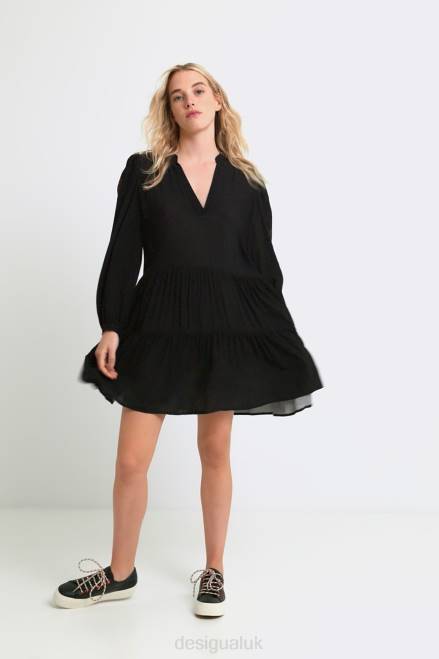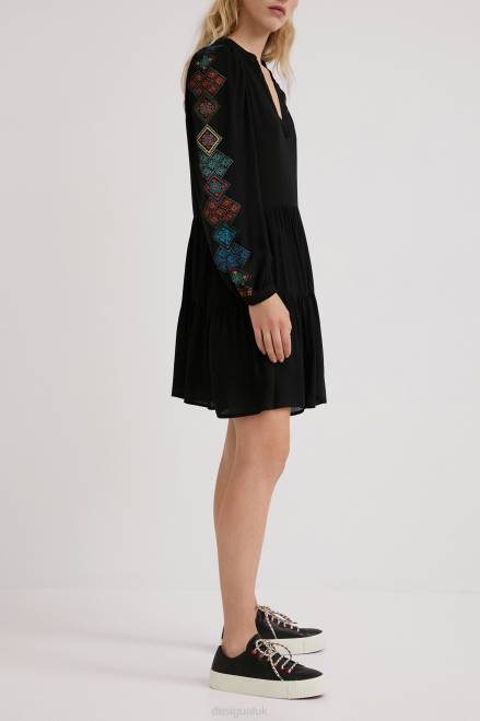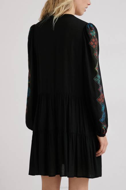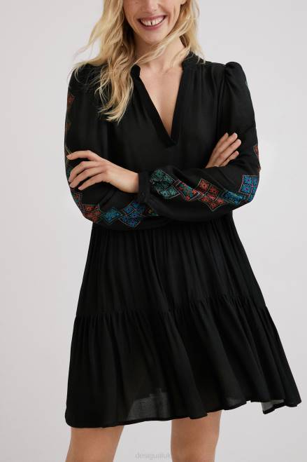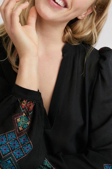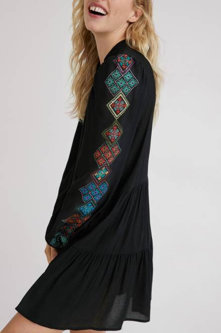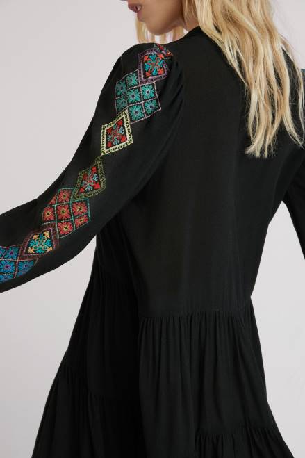 V-neck and subtle balloon sleeves with full-colour positional ethnic embroideries and an A-line skirt on a very comfortable eco-friendly viscose dress.