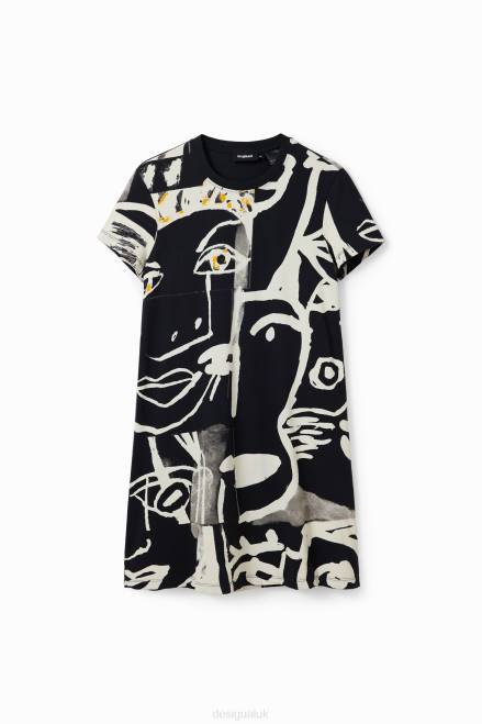 A short dress in a T-shirt style with short sleeves and a contrasting face print designed by Javier Mariscal.