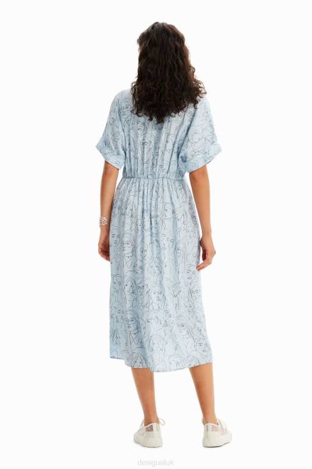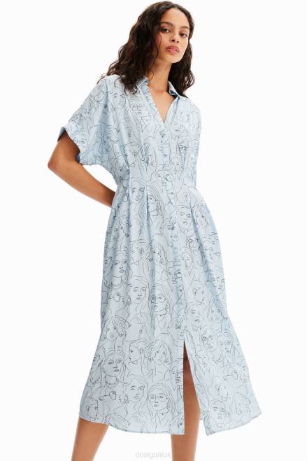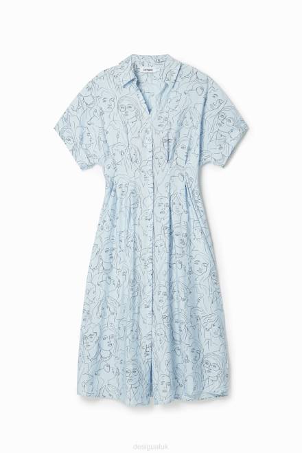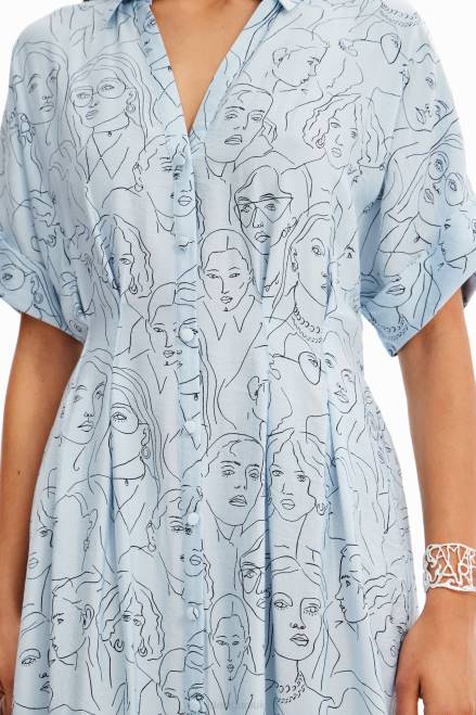 A short-sleeve midi shirt dress with a V-neckline, a double pleat detail on the waist, a wide skirt and textured satin fabric featuring printed faces.