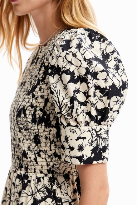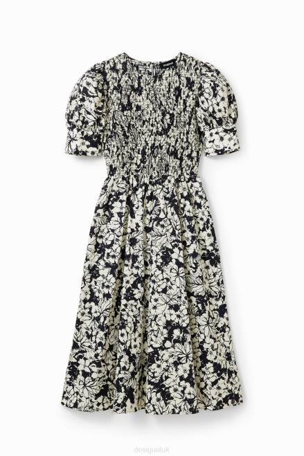 A cotton midi dress with short sleeves and a fitted stretch body with smock stitch. Featuring a two-tone floral print.