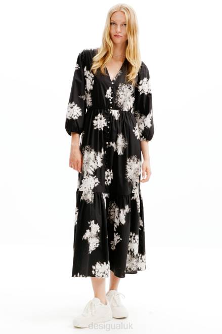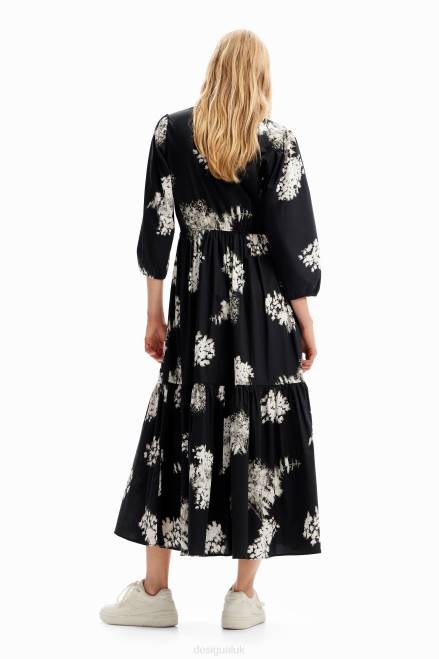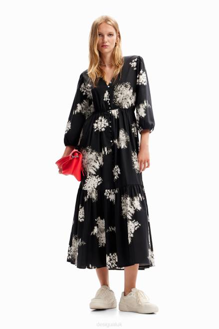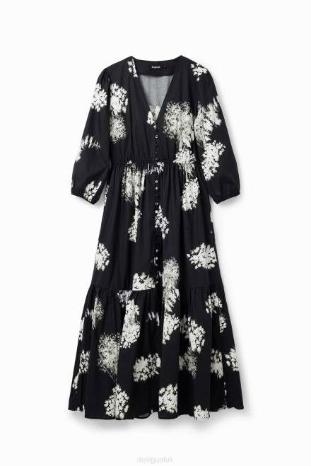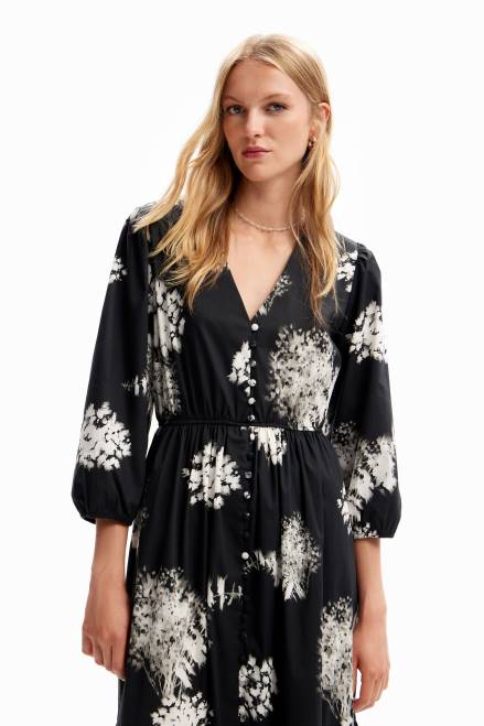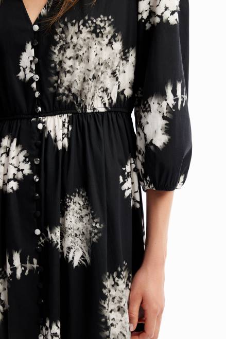A midi shirt-style dress with a V-neckline, 3/4 sleeves, a skirt with gathered panels and decorative buttons, and poplin with a photographic floral print.