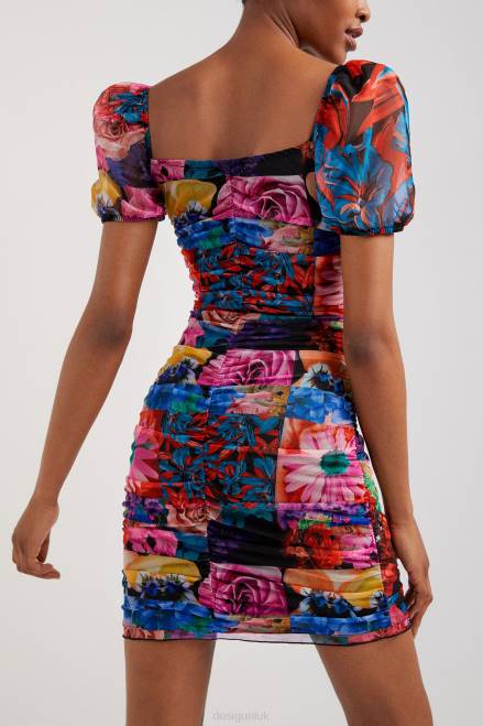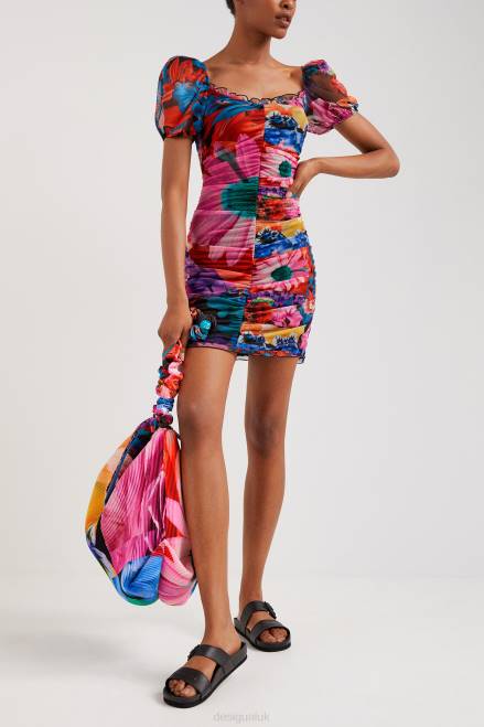 Made from eco-friendly viscose tulle and featuring a brightly coloured floral full print. This dress is ruched all over, sits above the knee and has balloon sleeves.