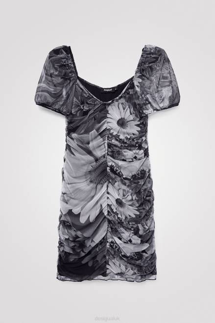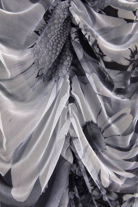 Made from eco-friendly viscose tulle and featuring a black and white floral full print. This dress is ruched all over, sits above the knee and has balloon sleeves.