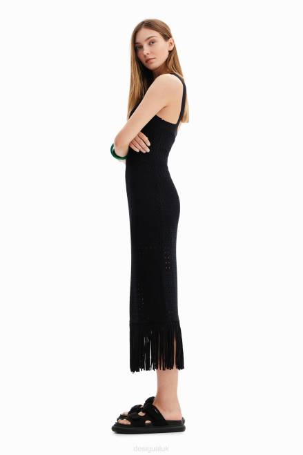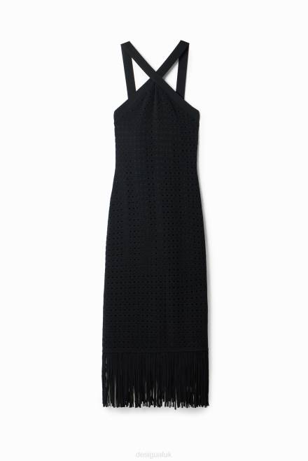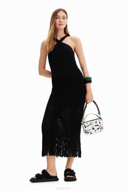 A fitted midi dress with a halter neck, knit fabric with openwork and fringing on the hem.