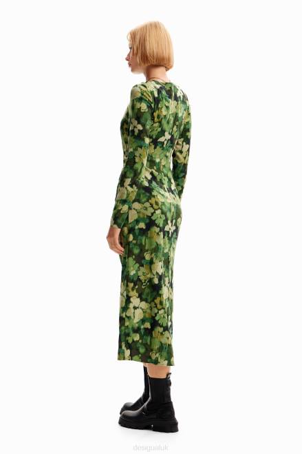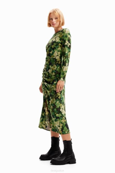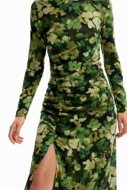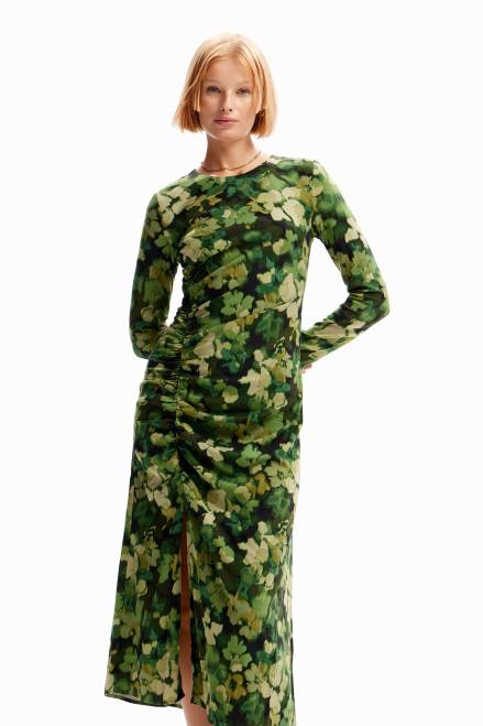 A fitted midi dress with long sleeves and rounded side seams with gathering that end at the slit on the skirt.