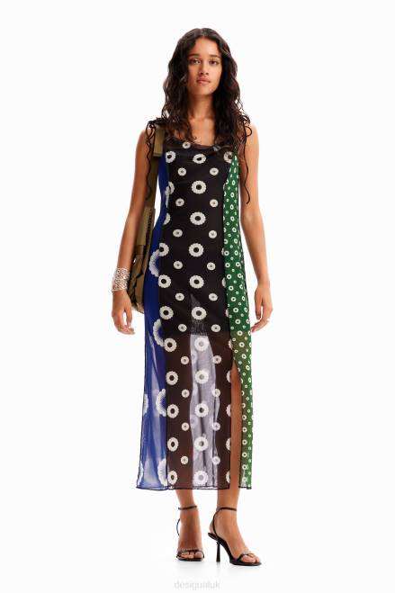 A fitted midi dress with straps, a draped neckline, a slit at the hem and tulle with a geometric New Heritage print in various colours.