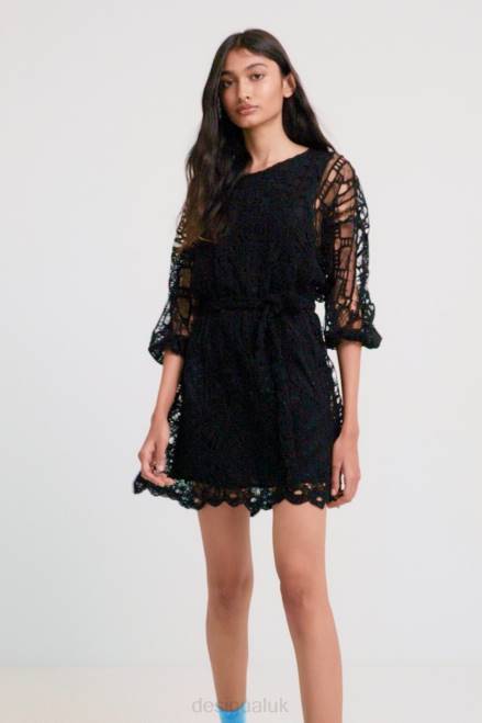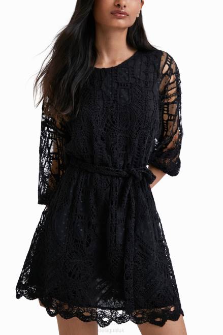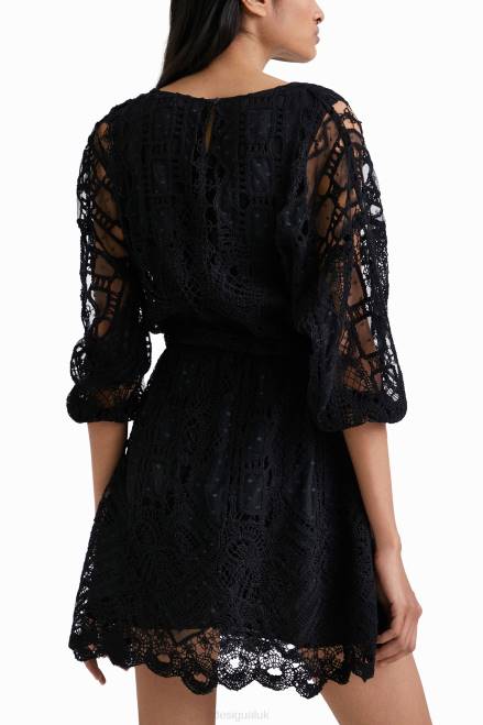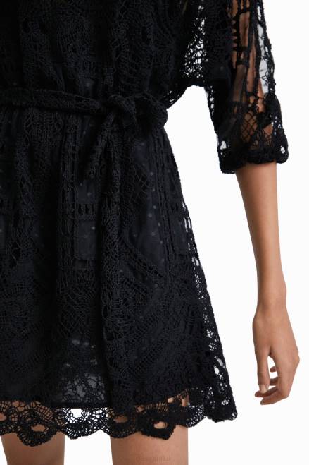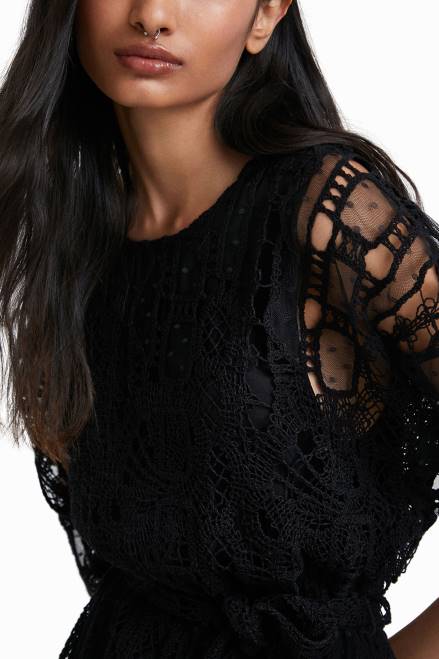 This vintage and boho-inspired short crochet-style dress with tone-on-tone plumeti fabric is part of the collection created by Johnson Hartig.
