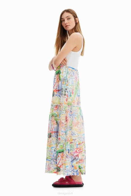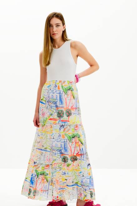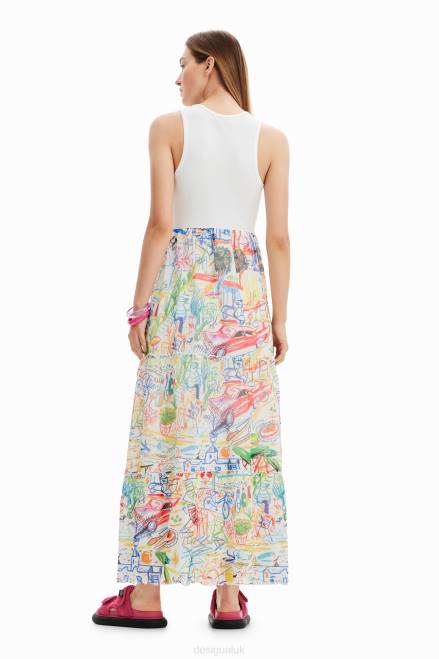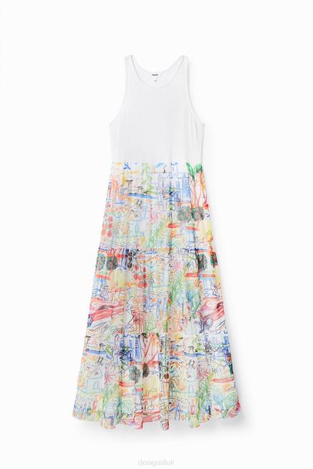 A long dress with a two-piece effect: a sleeveless ribbed T-shirt and a tulle skirt with several panels printed with illustrations by Javier Mariscal.
