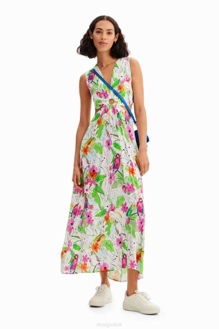 A long sleeveless dress with a V-neckline, a ring detail with gathering under the bust and side cut-outs. Featuring an illustrated tropical print.