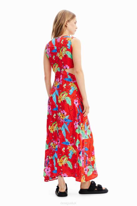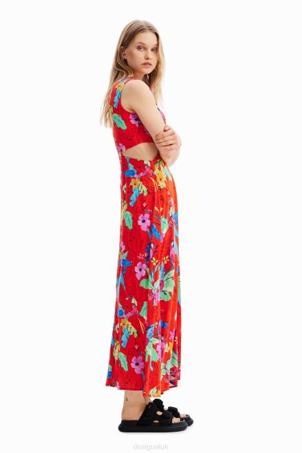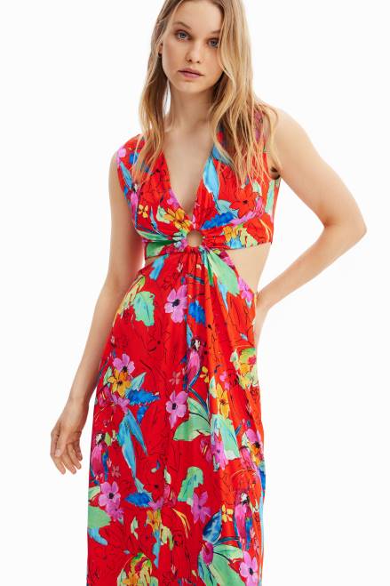 A long sleeveless dress with a V-neckline, a ring detail with gathering under the bust and side cut-outs. Featuring an illustrated tropical print.