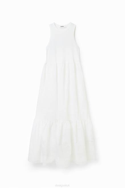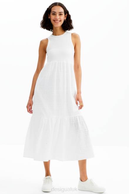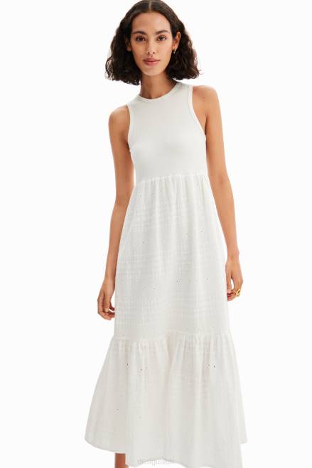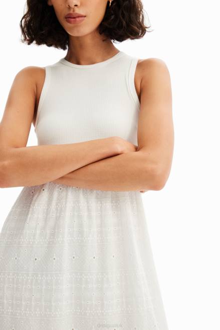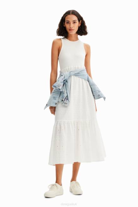A long dress with a two-piece effect: a sleeveless ribbed T-shirt combined with a cotton skirt with Swiss embroidery in different shapes.
