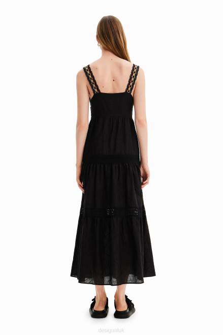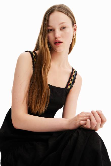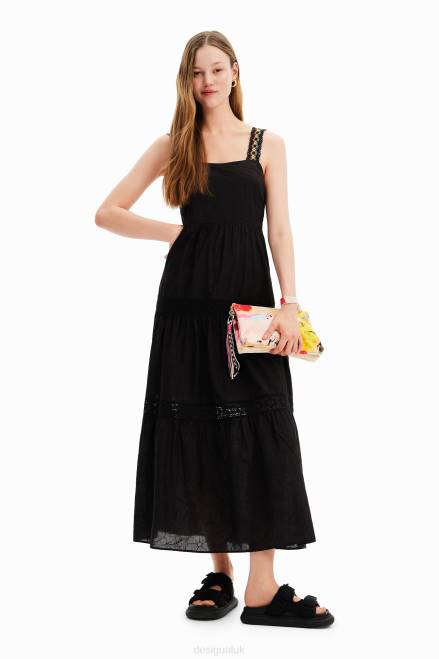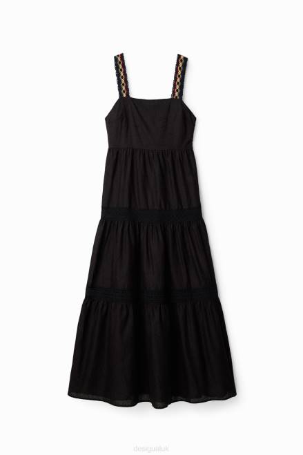 A long dress with wide straps, fitted bust, floral embroidery and ruffle-effect panels.