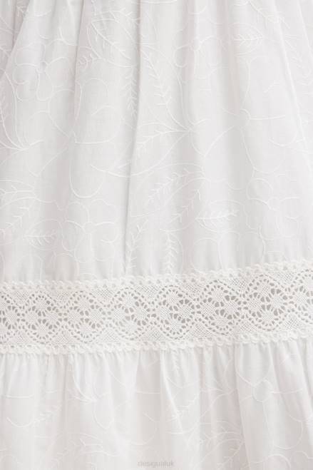A long dress with wide straps, fitted bust, floral embroidery and ruffle-effect panels.