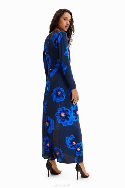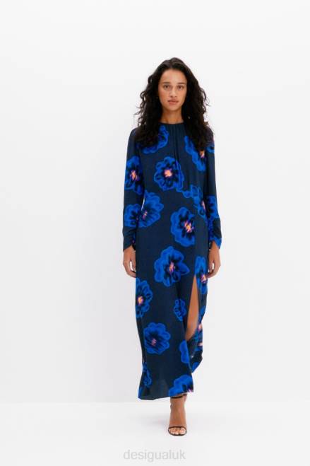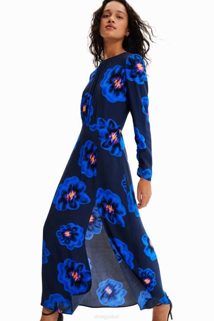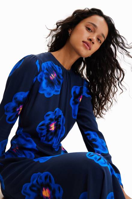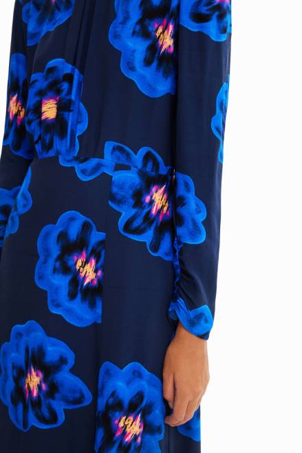 A long dress in lightweight fabric with a floral print, gathered details, long sleeves and a front slit on the skirt.