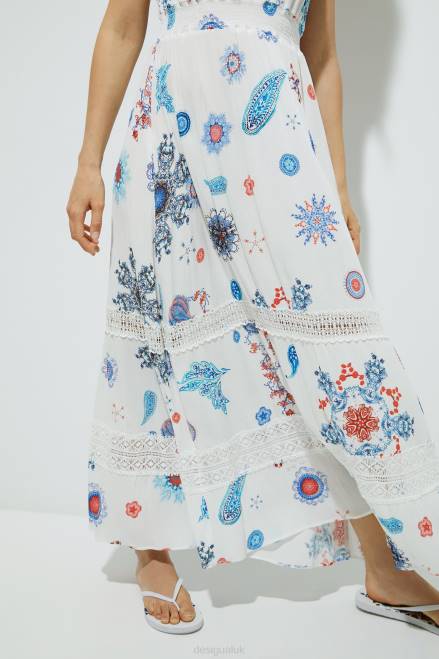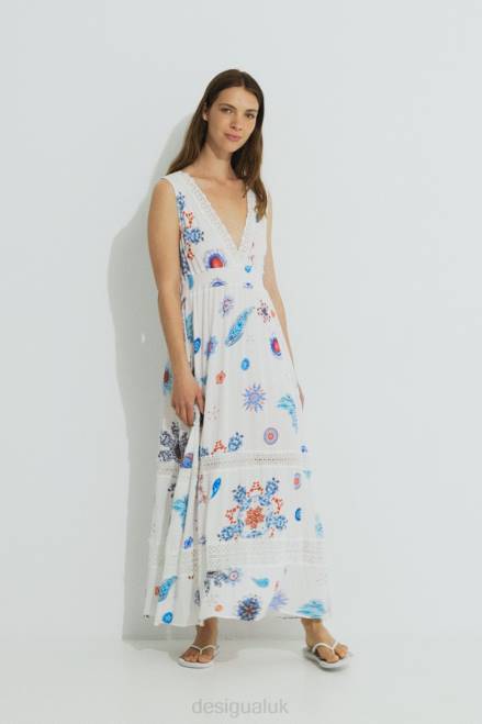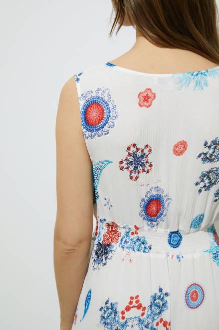 Sleeveless, with crossed V-neckline, fitted and elastic waist and a lovely print of coloured floral mandalas. With bands of crochet on neckline and on the skirt.